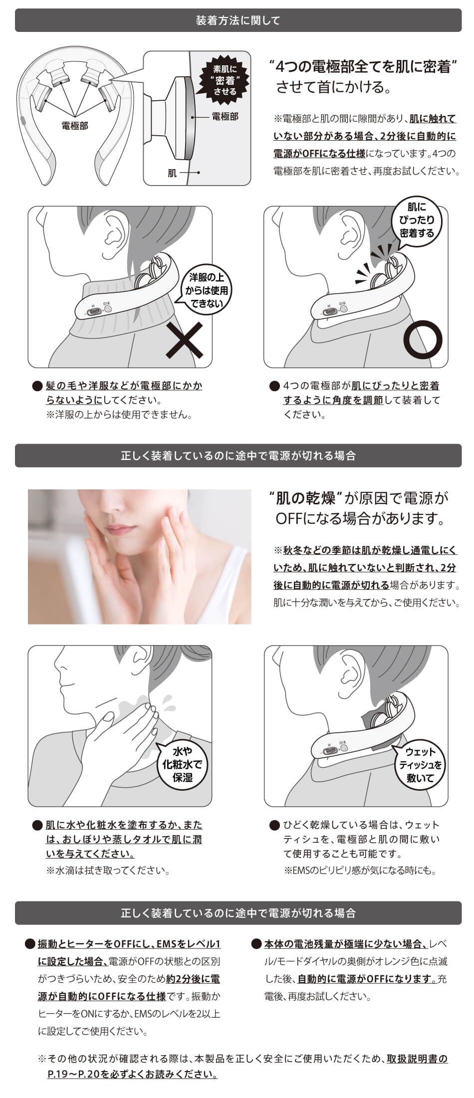 大型のEMS電極を4個そなえ、パワフルな刺激を実現しました。軽いフィーリングから、ギューっとしぼられるような強い感触まで、自在にEMS強度の調整が可能です。パワフルな刺激で首・肩まわりの筋肉をしっかりと「鍛える」ことを実現しました。