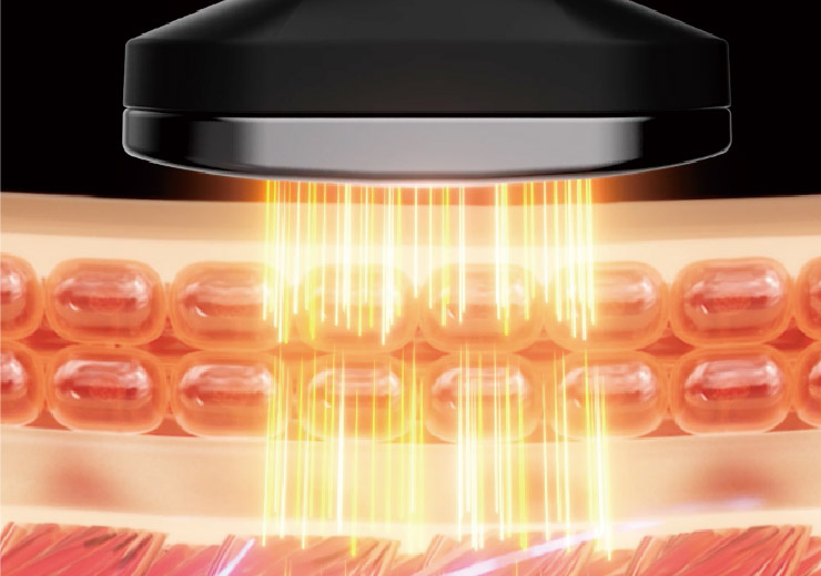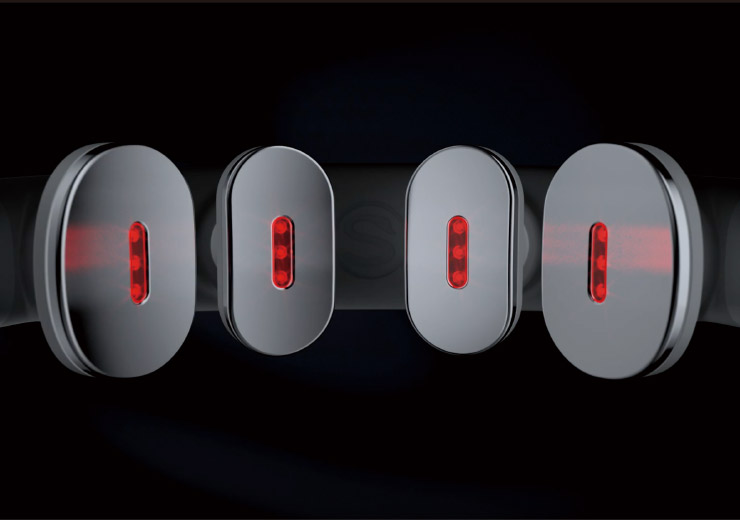 電極の中心部に640nmの近赤外線を発するLEDを3個ずつ、合計12個搭載。近赤外線は筋肉の10mmの深さまで浸透、深部の血流を改善し、首まわりの筋肉の緊張をやわらげます。