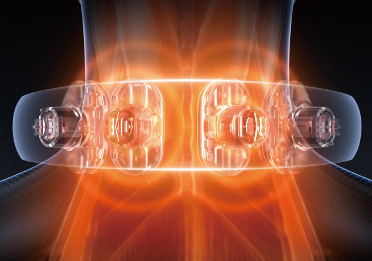 4つの偏心ホイールを交互に動かすことで複雑な体感を生み出します。単純な振動を与えるだけでなく、首まわりの筋肉に立体的にアプローチしつつも、高出力で持続的で強力な振動効果を生み出します。