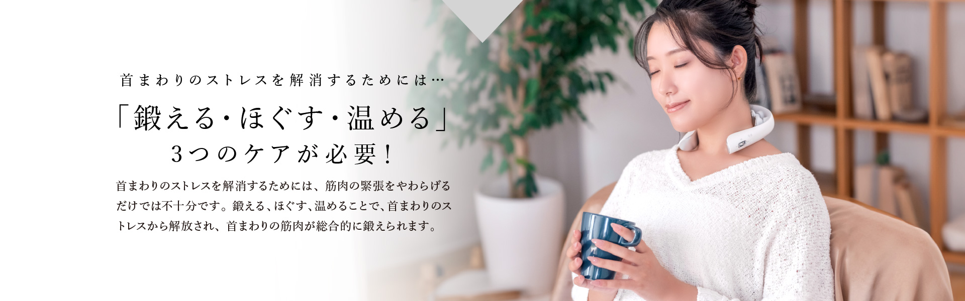 朝のコーヒータイム、お昼休み、お風呂上がり・・・日常のふとした時間を利用して「ながらケア」を行うことで、首まわりにストレスが溜まらないようにすることができます。毎日15分のケアで、悩みのない毎日を送りましょう。